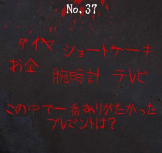 ホーム > 謎解きゲーム > 謎解き~廃墟からの脱出~|攻略とヒントと答え(9階No.33~No.40) 2017/02/05 2017/03/29 目次No.33No.34No.35No.36No.37No.38No.39No.40キーワードの答えスポンサードリンク No.33ヒントタップで表示「10位」は何と読む?答えタップで表示「10位=じゅうい」なので、答えは「獣医」となる。ページのトップへNo.34ヒントタップで表示四角い紙を折っていくと手裏剣や鶴になる。答えタップで表示答えは「折り紙」となる。ページのトップへNo.35ヒントタップで表示絵や数字を漢字にすると?答えタップで表示答えは「早朝」となる。ページのトップへNo.36ヒントタップで表示それぞれのパーツを組み立てて熟語を作る。答えタップで表示答えは「筋肉」となる。ページのトップへNo.37ヒントタップで表示「あり」がたかった答えタップで表示「蟻がたかった」ので、答えは「ショートケーキ」となる。ページのトップへ No.38ヒントタップで表示黒い部分に注目。答えタップで表示答えは「TITLE」となる。ページのトップへNo.39ヒントタップで表示誰でも持っているもの。答えタップで表示「夏目漱石(1000円)<紫式部(2000円)<新渡戸稲造(5000円)<福沢諭吉(10000円)」となり、お札を表している。 答えは「福」となる。ページのトップへNo.40ヒントタップで表示英語を漢字に直すと?答えタップで表示英語を漢字に直すと、「day=日」「moon=月」となり、組み合わせて「明」となる。ページのトップへキーワードの答えタップで表示ジャンボジェットページのトップへスポンサードリンク ページのトップへ No.1~No.8 No.9~No.16 No.17~No.24 No.25~No.32 No.33~No.40 No.41~No.48 No.49~No.56 No.57~No.64 No.65~No.72 No.73~No.80 No.81~No.88 No.89~No.96 No.97~No.104 攻略トップページのトップへ B! LINEへ送る - 謎解きゲーム Jammsworks, 謎解き~廃墟からの脱出~