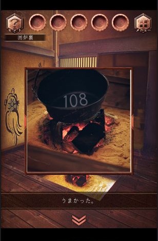 囲炉裏に移動し、鍋を拡大する。